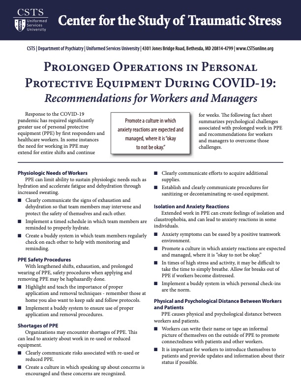 Prolonged Operations in Personal Protective Equipment during Covid-19: Recommendations for Workers and Managers Post author By Center for the Study of Traumatic Stress Post date 27 March 2024