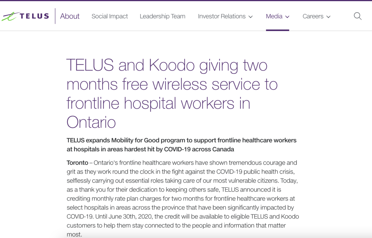 Two months of free wireless service to frontline hospital workers in Ontario.